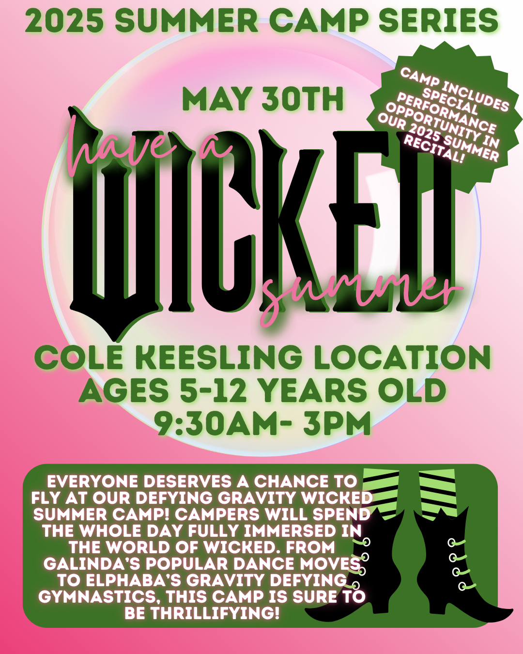 Defy gravity at our have a Wicked Summer Camp! Full of Dance, Tumbling, and Wicked fun!